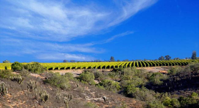 明朗如鏡的天空,映襯著連綿起伏的山丘,偶爾可見仙人掌、山楂樹和其它一些低矮的灌木叢,而在山谷之地,卻分布著成片的葡萄園,綠色的葡萄葉、黃色的土地與藍(lán)色的天空交相輝映,這就是阿塔卡馬沙漠(Atacama Desert)南部的風(fēng)光,著名的利馬里谷(Limari Valley)產(chǎn)區(qū)便坐落于此。