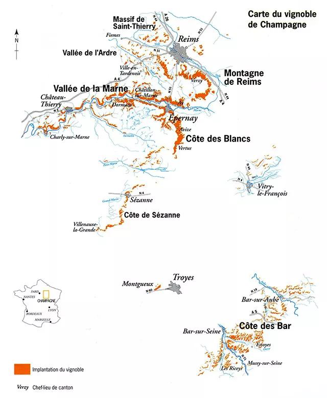 44個中最著名的代表有:Hautvillers,Vertus,VIllers-Marmey,Cumières,Mareuil sur Aÿ。