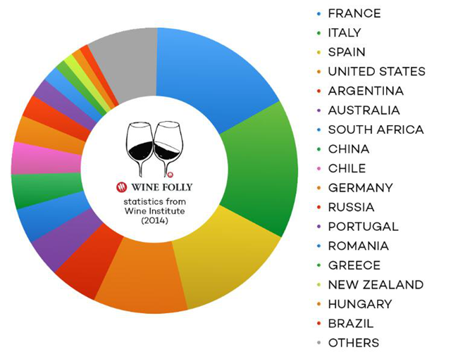 世界三大葡萄酒生產國是法國,意大利,西班牙。這三個國家幾乎生產了世上一半的葡萄酒,足夠填滿5127個奧運會大小的游泳池。