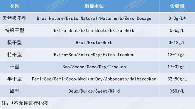需要注意的是,天然極干型起泡酒是不允許使用含糖的調味液進行補液的,表中0-3g/L的含糖量指的是二次發酵后酒中殘糖的含量范圍。