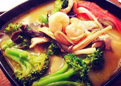 這是一道泰國(guó)名湯,世界十大名湯之一,將輔料放入桶煲至出味,而后放入大頭蝦、草菇、椰汁等一起燉煮,酸味鮮美開(kāi)胃。這湯以色澤全紅、湯味馥郁可口而著稱。