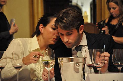四種味感中:舌尖對甜最敏感;接近舌尖的兩側對咸最敏感;舌的兩側對酸最敏感;舌根對苦最敏感。品酒時入口不要馬上吞下,要用整個味蕾去感受葡萄酒中的味道。先將酒含在口中,做咀嚼吸氣動作,反復于口腔中進行攪動,布滿口腔四周,舌頭兩側、舌背、舌尖,并延伸到喉頭底部,讓香味散發到整個口腔中。品嘗后,葡萄酒留下來的余香具有持久性,這就是余韻。