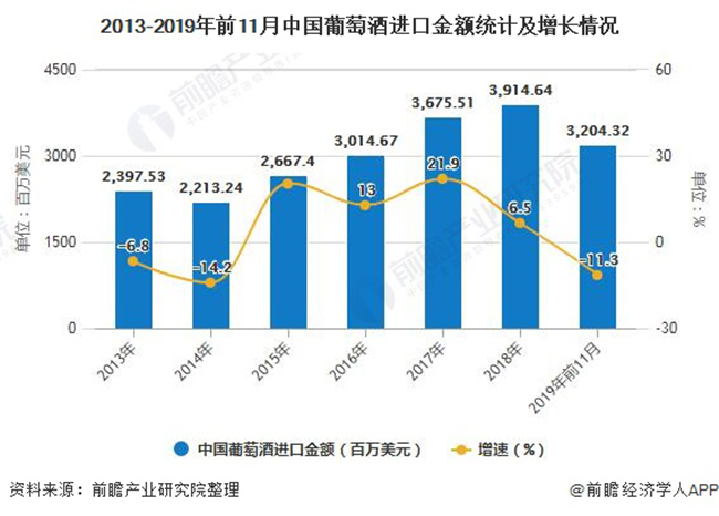 在進(jìn)口金額方面,2019年11月中國葡萄酒進(jìn)口金額為31185.5萬美元;2019年11月中國葡萄酒進(jìn)口均價為0.59萬美元/千升,相比10月下跌了0.04萬美元/千升。累計方面,2019年1-11月中國葡萄酒進(jìn)口金額為3204321千美元(3204.32百萬美元),同比下降11.3%,進(jìn)口均價為0.53萬美元/千升。