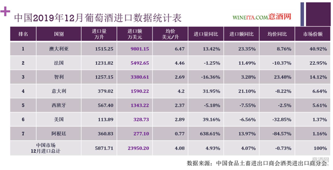 近日,中國食品土畜進出口商會酒類進出口商分會發布了來自中國海關的2019年度中國進口葡萄酒統計數據。2019年中國進口葡萄酒總量為61245.88萬升,進口總額為24.3371億美元,分別相比2018年下降了10.91%和14.8%。進口葡萄酒均價為3.97美元/升,同比2018年度下降了4.57%。