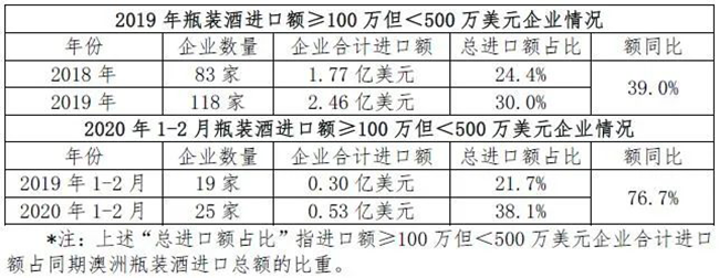 今年1-2月,盡管疫情對行業有一定沖擊,但澳洲瓶裝酒進口頭部企業基本穩住陣腳。雖然進口額≥1000萬美元的企業僅1家,少于去年同期,但其進口額同比增長近30%;而進口額≥500萬但小于1000萬美元的企業有2家,數量增加,其中,1家進口額實現倍數增長,1家為新的行業進入者。