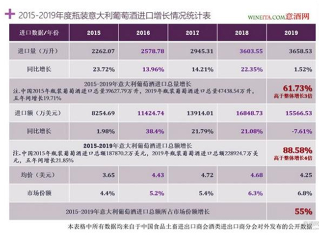 “與美國(guó)、加拿大等成熟市場(chǎng)相比,中國(guó)為代表新興市場(chǎng)的數(shù)據(jù)變化更能說明意大利葡萄酒逆勢(shì)上揚(yáng)的現(xiàn)象,”意酒網(wǎng)負(fù)責(zé)人宮照馥分析稱,“從近幾年的數(shù)據(jù)來看,2015-2018年,中國(guó)市場(chǎng)瓶裝意大利葡萄酒進(jìn)口總額連續(xù)四年增長(zhǎng),只有2019年度相比2018年度下降7.61%。五年間,瓶裝意大利葡萄酒進(jìn)口總額從2015年的8254.9萬美元,增長(zhǎng)至2019年的1.5566億美元,五年間增長(zhǎng)88.58%,進(jìn)口額增長(zhǎng)率是同期中國(guó)市場(chǎng)瓶裝葡萄酒進(jìn)口總額增長(zhǎng)率的4倍。而從市場(chǎng)份額角度衡量,2015-2019年,中國(guó)市場(chǎng)瓶裝意大利葡萄酒進(jìn)口額所占市場(chǎng)份額,實(shí)現(xiàn)連續(xù)五年增長(zhǎng),從2015年的4.4%的市場(chǎng)份額,增長(zhǎng)至2019年的6.8%的市場(chǎng)份額。我的預(yù)測(cè)是,按照現(xiàn)有的五年市場(chǎng)份額增速55%,意大利的市場(chǎng)份額將增加到10.54%。”