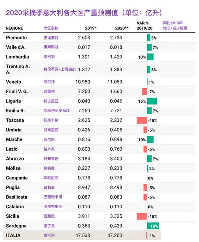 從意大利國內各大區的葡萄酒產量來看,今年意大利北部的葡萄酒產量同比2019年略增加了3%,中部和南部則分別減少了2%和7%。