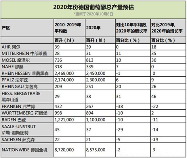 在德國(guó)全境范圍內(nèi),目前預(yù)計(jì)2020年的總產(chǎn)量約為8.6億升,接近10年來平均8.7億升的總產(chǎn)量,將比2019年的總產(chǎn)量高出3%。