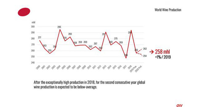 在經(jīng)歷了2018年異常高的產(chǎn)量后,預(yù)計全球葡萄酒產(chǎn)量將連續(xù)第二年低于平均水平。
