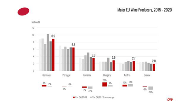 北半球2020年的采收并未受到因疫情封鎖措施的強烈影響。2020年,歐盟國家葡萄酒產(chǎn)量為159億升(mhl),占全球總產(chǎn)量的62%。