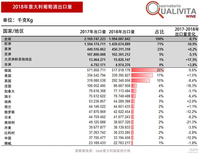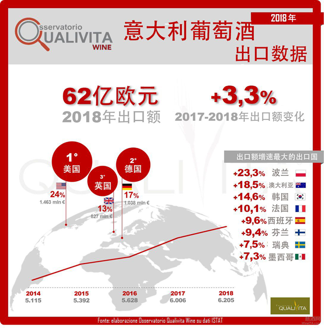 近日,意大利葡萄酒聯合會觀察委員會(Osservatorio del Vino di Unione Italiana Vini)和意大利農業和食品市場研究所(Ismea)聯合發布了2018年意大利葡萄酒出口報告。報告顯示,2018年,意大利葡萄酒的出口總額達到62億歐元,比2017年同比上升3.3%。歐洲市場占意大利葡萄酒出口額的61%(同比2017年增長3.2%),美洲市場占31%(同比增長3.3%),亞洲市場占7%(同比增長2.4%)。