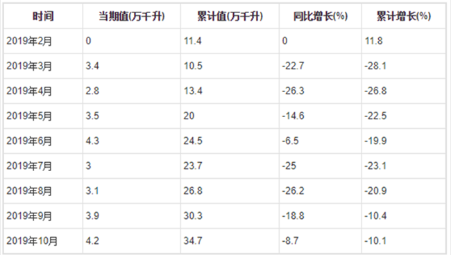 根據中國報告大廳對2019年1-10月全國葡萄酒產量進行監測統計顯示:2019年10月全國葡萄酒產量4.2萬千升,同比下降8.7%,2019年1-10月全國葡萄酒產量為34.7萬千升,累計下降10.1%。