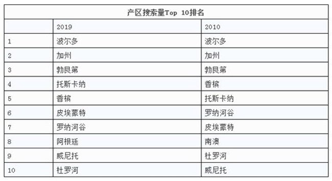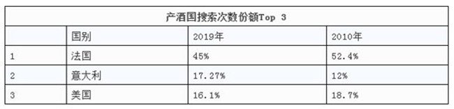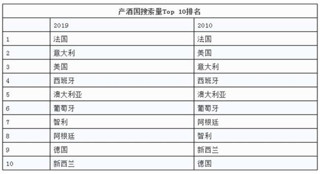 數據顯示,2019年在葡萄酒搜索器搜索量排名前十位的葡萄酒產酒國分別為法國、意大利、美國、西班牙、澳大利亞、葡萄牙、智利、阿根廷、德國與新西蘭。這份榜單的排位與2010年有些許不同。在2010年,美國在意大利之前,阿根廷則排列在智利之前,新西蘭在德國前面。