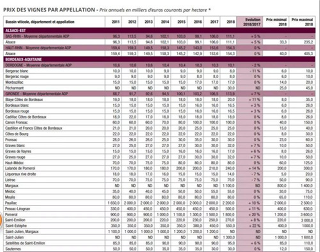 2) 漲幅高達(dá)+20%的波美候產(chǎn)區(qū)(Pomerol),由2017年的150萬歐元/公頃上漲到2018年的180萬歐元/公頃。