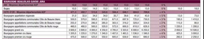 博艮第產(chǎn)區(qū)金丘所有AOP葡萄園都呈上漲趨勢,漲幅也都很均勻,在2%到5%之間。其中漲幅最大的兩個AOP產(chǎn)區(qū)分別是“博艮第大區(qū)級別(Bourgogne Appellation Régionale)”,由2017年的4.1萬歐元/公頃上漲到2018年的4.3萬歐元/公頃,漲幅高達(dá)5%。另外一個漲幅高達(dá)5%的產(chǎn)區(qū)是“博艮第一級紅葡萄園”(Bourgogne 1er Cru rouge),由2017年的65萬歐元/公頃上漲到2018年的68萬歐元/公頃。