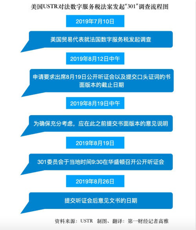 USTR在對法“301調查”后,認定法國數字服務稅歧視美國企業,擬向63項總價值為24億美元的法國輸美產品加征最高100%的關稅,USTR此前還特地在聲明中指出,在聽證會后,希望“迅速進行征稅等活動”。