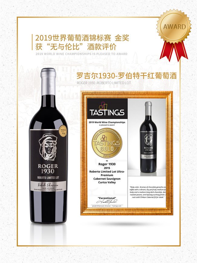 羅吉爾1930-羅伯特紅葡萄酒呈深邃的寶石紅色;酒香非常柔和,伴有精致的黑加侖,黑李子的果香以及甘草、煙熏的香氣;口感優(yōu)雅豐富,層次鮮明且多變,單寧強(qiáng)勁,令人十分愉悅。在榮獲2020柏林葡萄酒大獎(jiǎng)賽金獎(jiǎng)的榮譽(yù)之前,就已經(jīng)獲得了2019世界葡萄酒錦標(biāo)賽金獎(jiǎng)的榮譽(yù),以及“無(wú)與倫比”酒款評(píng)價(jià)!