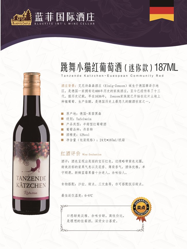 跳舞小貓紅葡萄酒187ml(迷你款),酒色呈現(xiàn)出亮麗的寶石紅色,邊緣略帶紫色光圈;甜美濃郁的漿果氣息以及花香、薄荷香氣;酒體優(yōu)雅,單寧順滑,新鮮藍(lán)莓果醬十分迷人,余味怡人??纱钆渖忱?、甜點(diǎn)、三文魚等一起食用,亦可搭配飯后甜點(diǎn)。