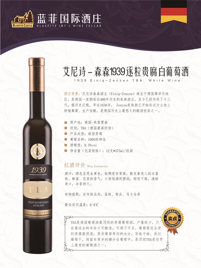 艾尼詩(shī)-森森1939逐粒貴腐白葡萄酒的級(jí)別是Qmp-TBA(逐粒精選葡萄干),TBA是德國(guó)葡萄酒最頂級(jí)的貴腐葡萄酒,產(chǎn)量極少,只在最適合的年份才可釀造,可遇不可求。尼詩(shī)-森森1939逐粒貴腐白葡萄酒對(duì)于葡萄的要求特別高,葡萄要完全受到貴腐菌侵襲,蒸發(fā)葡萄果肉的水分,導(dǎo)致干枯,類似葡萄干,從而保留非常多的糖分在葡萄中。而頂級(jí)TBA是世界上最貴的葡萄酒之一。
